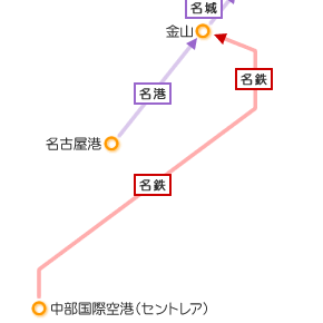 名鉄空港[特急]中部国際空港駅 →名鉄空港[特急]名鉄名古屋駅 (名古屋市営地下鉄に乗り換え) →名古屋市営地下鉄桜通線名古屋駅 →名古屋市営地下鉄桜通線丸の内駅 |